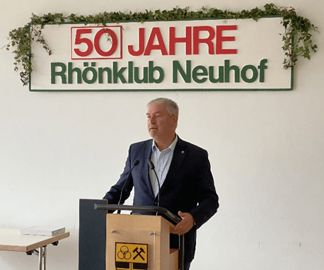 Bürgermeister Heiko Stolz, der erste Beigeordnete der Gemeinde Neuhof Franz Josef Adam, der erste Beigeordnete der Gemeinde Kalbach Markus Hackenberg, Oliver Jahn in Vertretung von Pfarrerin Frau Anke Händler-Kläsener, der Rhönklub Präsident Jürgen Reinhard und der Vorsitzende der Rhönklub-Region Fulda Philipp Jahn. Mit Freude habe er registriert, dass sie alle seiner Einladung gefolgt seien. Ihre Anwesenheit unterstreiche die dem Rhönklub Zweigverein entgegengebrachte Wertschätzung.