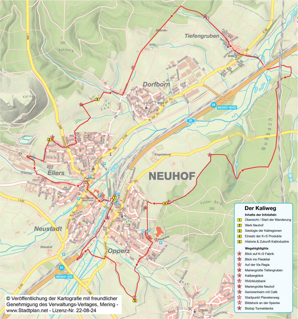 Der Jubiläums-Themenwanderweg „Der Kaliweg“ ist als Rundwanderweg ausgeführt und bietet herrliche Aussichten und interessante Wegehighlights. Den Kaliberg hat man fast immer im Blick und die elf Wegehighlights auf der Strecke vermitteln dem Wanderer einzigartige Einblicke in Natur, besondere Orte, Gewerbe und Industrie rund um Neuhof.